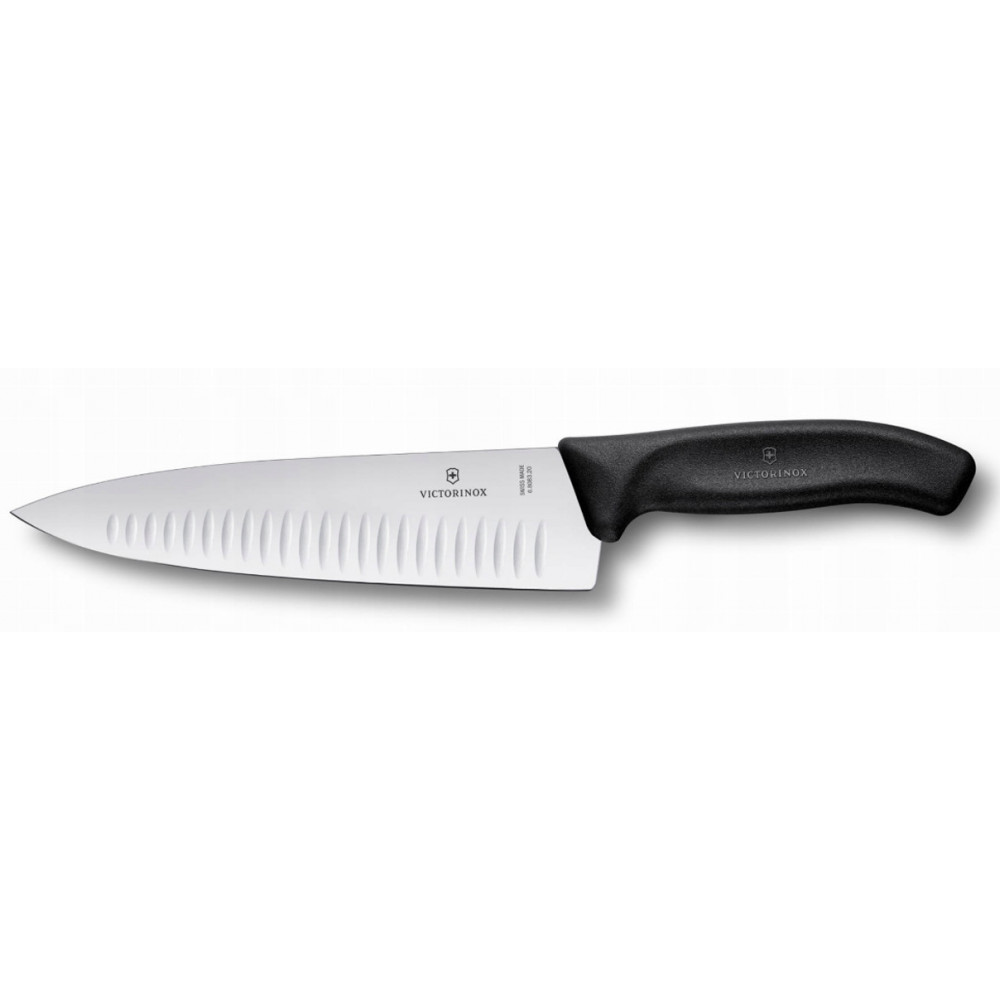 Поварской нож SWISS CLASSIC с широким рифленым лезвием 20 см и черной ручкой. Этот достаточно большой нож без труда режет сырые и вареные овощи, разделывает сырое, готовое и замороженное мясо, рыбу, измельчает лук, зелень, давит чеснок. Те, кто привык пользоваться на кухне одним ножом, будут в восторге от этого универсала. А рифленое лезвие (специальные канавки на боковой части) уменьшает трение, обеспечивая плавные и точные разрезы, минимизируя прилипание продукта к ножу во время работы.