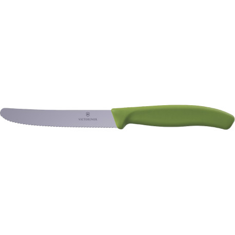 Victorinox 6.7834.E575 - швейцарский нож для томатов Swiss Classic с серрейторным лезвием 11 см и ручкой оливкового цвета. Модель со спецификацией Tomato&Table – это небольшой, но универсальный нож, который станет незаменимым помощником на кухне и за столом. Он отлично справится не только с нарезанием помидоров, овощей и фруктов, но и легко режет мягкие сыры, зелень или хрустящий багет. Благодаря закругленному острию им удобно намазывать масло, мед или варенье, что делает его практичным и в качестве столового ножа.