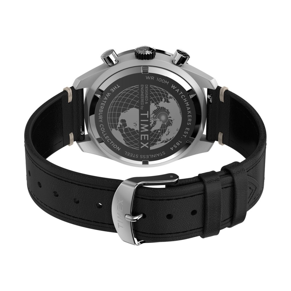 Мужские кварцевые часы Timex WATERBURY Traditional Chronograph 41 мм с хронографом, тахиметром и датой на черном кожаном ремешке. Модель оснащена хронографическим механизмом для точного отслеживания прошедшего времени и тахиметрическим безелем для определения средней скорости. Уникальные тональные субциферблаты создают сдержанный и изысканный цветовой контраст с синим циферблатом, на котором расположено окошко даты между 4 и 5 часами, а также крупные часовые метки, подчеркнутые ярким красным цветом. На заводной головке красуется логотип Waterbury Watch Company, а кнопки хронографа украшены текстурой в виде перекрестной штриховки. Экологичный ремешок из гладкой кожи, полученной от Leather Working Group (LWG), оснащен быстросъемными пружинными штифтами для легкой замены ремешка без использования инструментов.