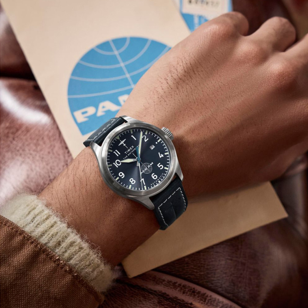 Timex x Pan Am® WATERBURY Automatic TW2Y38800 - автоматические водонепроницаемые часы 41 мм на синем кожаном ремешке. Первые автоматические часы, созданные в рамках продолжающегося сотрудничества Timex с Pan American World Airways - одной из самых больших авиакомпаний США. Эта модель пополнила коллекцию Waterbury и представляет лаконичный дизайн в стиле милитари, характерный для традиционных пилотских часов. Индикатор даты и мотив самолета на синем циферблате с эффектом солнечных лучей. Этот же самолет изображен на ремешке из натуральной кожи, обработанной экологически чистым способом, от Leather Working Group (LWG), с контрастной строчкой и культовой синей подкладкой Pan Am. Быстросъемные пружинные штифты для легкой замены ремешка без использования инструментов. Японский автоматический механизм с 21 камнем, работающий без батарейки. Вместо этого, эти «самозаводящиеся» механизмы используют естественные движения вашего запястья в качестве источника энергии.