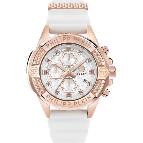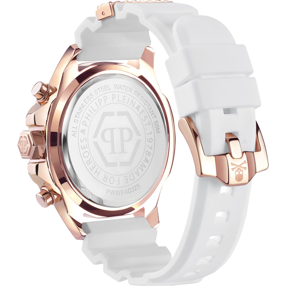 Philipp Plein THE $KULL Chrono 44мм/мужские часы/кварцевые/серебристый циферблат/белый ремешок /50м/Минеральное стекло/Стальной корпус с RGP Италия PWWFA0325 Гарантия: 2 года