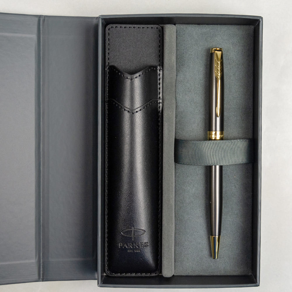Набор Parker: шариковая ручка в серо-золотой отделке SONNET Grey Lacquer GT в уникальной комплектации с черным чехлом в подарочной коробке.