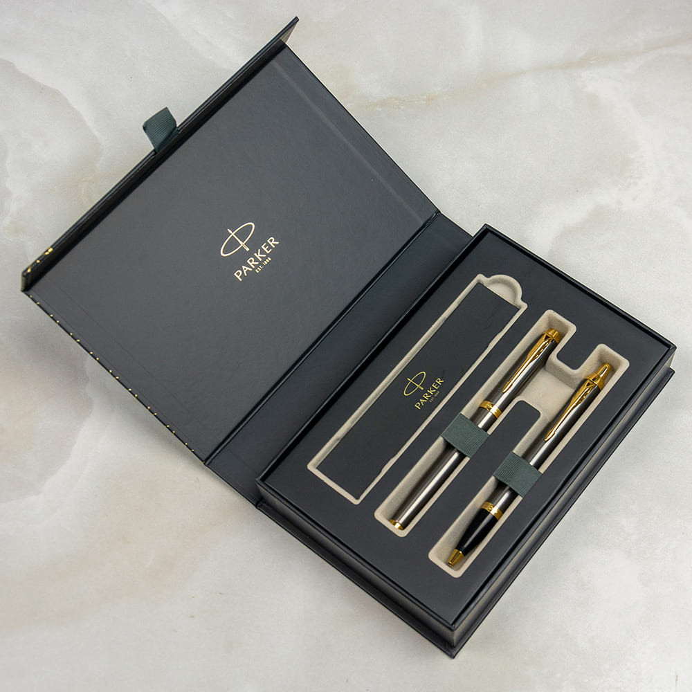 Набор ручек Parker IM Grey Lacquer GT RB+BP DUO24: роллерная и шариковая ручка в подарочной коробке на две ручке. Обе ручки представлены в отделке IM Grey Lacquer GT в роскошном серо-золотом сочетании. Новый фирменный дизайн Parker, который представляет суть элегантности и сдержанности бренда. Ручка-роллер позволит вам наслаждаться идеально сбалансированным и плавным письмом, которое предлагает комфорт использование шариковой ручки и изысканный чернильный след, напоминающий перьевую ручку. В шариковой ручке использован оригинальный стержень, а запаса чернил хватит на линию примерно 3,5 км.