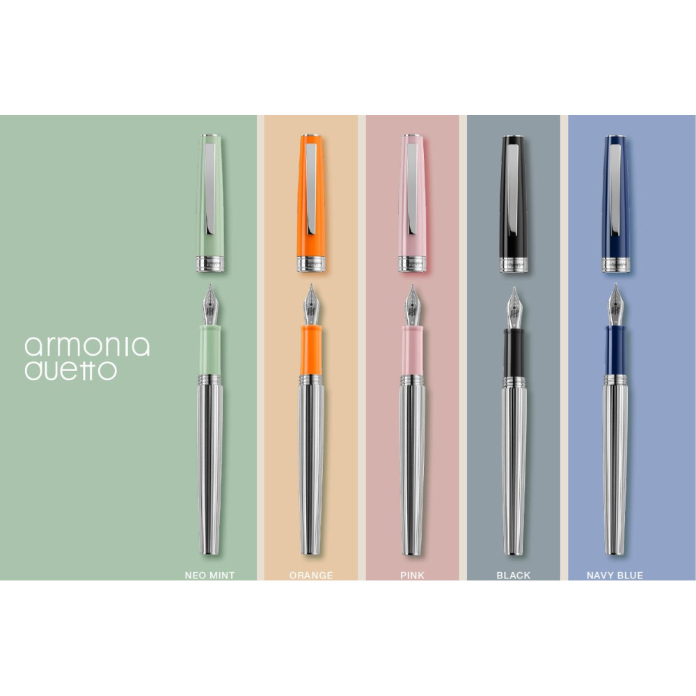 Линейка Duetto отличается полосатым металлическим корпусом с палладиевым покрытием и полимерным колпачком, предлагая элегантную альтернативу традиционному металлическому колпачку. Знаменитая коллекция ручек Armonia возвращается в ассортимент продукции итальянского бренда с обновленным дизайном Armonia Duetto и свежей цветовой палитрой. В рамках обновления Armonia получила диск на торце колпачка с гравировкой амбиграммы Montegrappa, плоский латунный клип с палладиевым покрытием, а также пять новых цветовых вариантов. Коллекция включает в себя роллеры, перьевые и шариковые ручки.