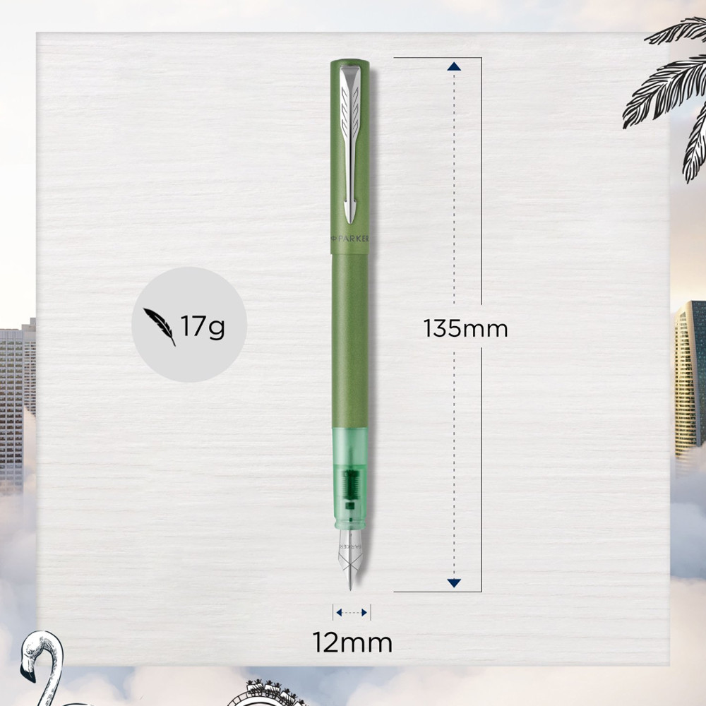 Parker VECTOR XL Metallic Green CT FP F (2159762) - перьевая ручка в зеленом матовом дизайне с тонким стальным пером. Vector XL - где стиль органично сочетается с надежной работой. Лучшая ручка для динамичного образа жизни. Студенты, молодые специалисты и творческие люди будут в восторге, ведь эта ручка создана для них.