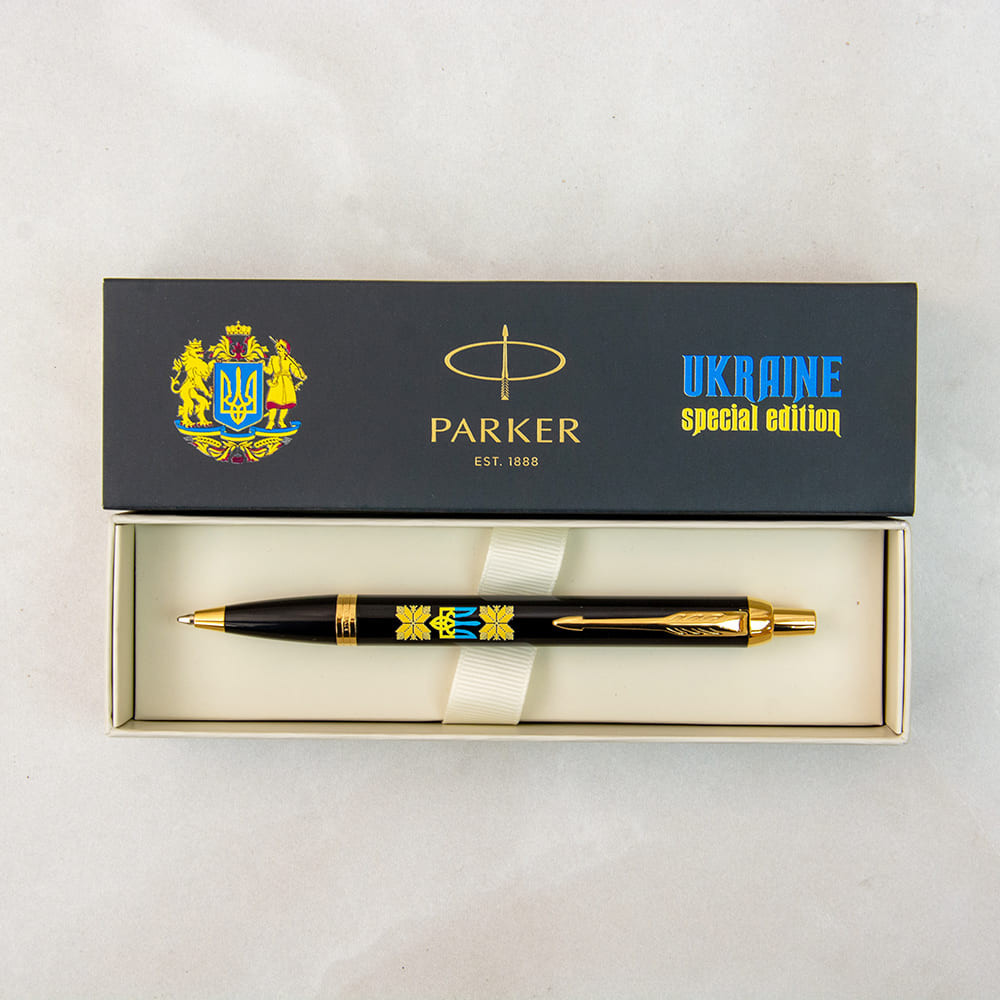 Шариковая ручка Parker IM UKRAINE Black GT, украшенная печатью Трезубцем в цветах Государственного Флага Украины и желтым орнаментом. Специальный выпуск с украинской символикой продемонстрирует вашу гордость быть украинцем и станет великолепным подарком на национальные и государственные праздники. Серия IM предлагает повседневные ручки с элегантным силуэтом и вневременным профессионализмом, дизайн и размер которых идеально подходит для мужчин и женщин. А подарочная коробка к новому эксклюзивному выпуску с геральдическими знаками и надписью Ukraine Special Edition добавит торжественности и уникальности моменту.