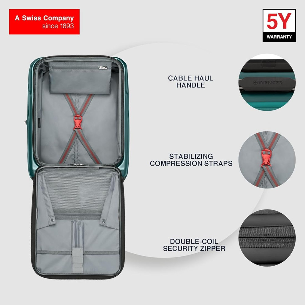 Wenger AMPLIX S Expandable (полікарбонат / 36-45 л / 54х38х23-28 см / колір - синьо-зелений) - маленька 4-колісна валіза з фронтальним відкриттям, розширенням та вбудованим TSA замком. Удароміцна та легка модель із серії Аmplix. Полікарбонат - один із найкращих матеріалів для виготовлення валіз. Його експлуатаційні характеристики, завдяки стійкості до ударів, здатності витримувати високі та низькі температури, дозволяють будь-які подорожі.