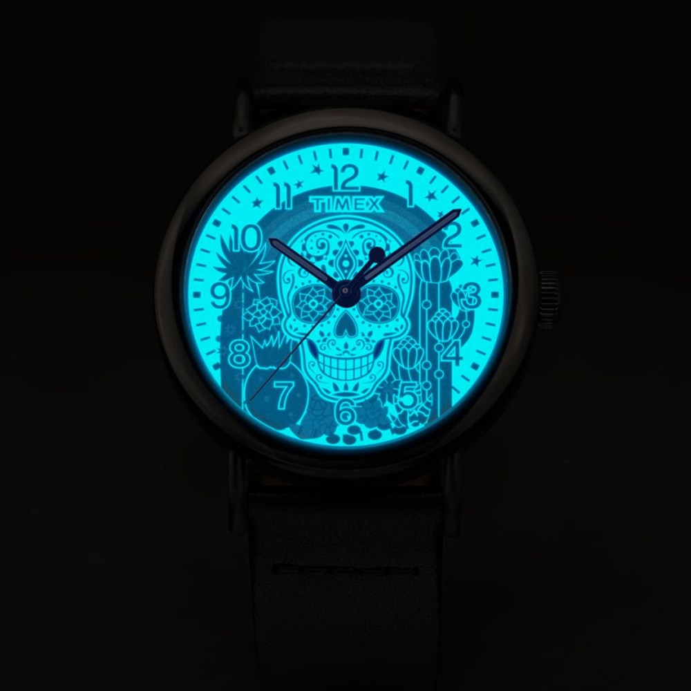 Чоловічий годинник Timex WEEKENDER Day of the Dead 40 мм з черепом, підсвічуванням Indiglo та чорним шкіряним ремінцем. У мексиканській культурі День мертвих – це час, коли згадують тих, кого втратили. Ця барвиста версія годинника Timex Weekender присвячена цьому особливому дню і прикрашена красиво декорованим черепом на циферблаті. Підсвічування INDIGLO® також надає нову яскравість дизайну черепа, виділяючи його, коли ви натискаєте на заводну головку годинника. Екологічний ремінець виготовлений із гладкої шкіри, отриманої від Leather Working Group (LWG).
