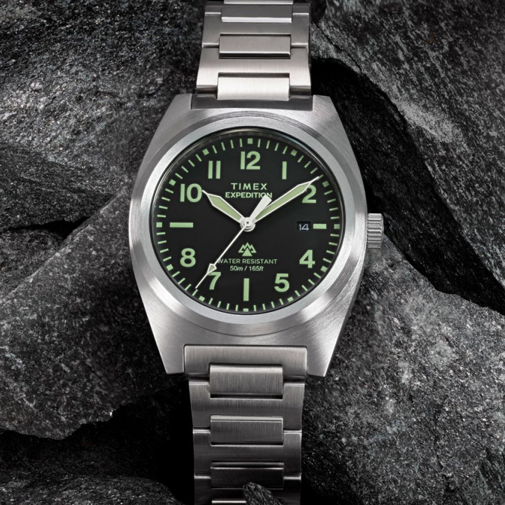 Timex EXPEDITION Field TW2Y18300 – кварцовий годинник з корпусом 39 мм та сталевим браслетом. Модель Expedition Capstone представляє новий дизайн корпусу бочкоподібної форми з матовою обробкою в колекції Expedition. Циферблат захищений плоским мінеральним склом і включає стрілки, що світяться, а також апертуру дати поряд з позначкою «3 години». Браслет зі сталі стійкий до корозії, іржі та щоденного зношування. Він також має щільно прилеглу кінцеву частину біля вушок, що забезпечує плавний перехід до корпусу.