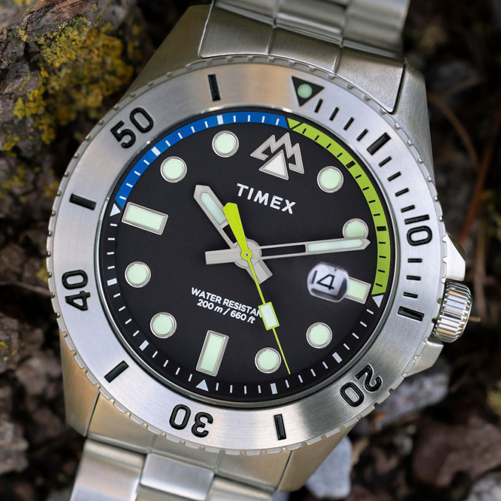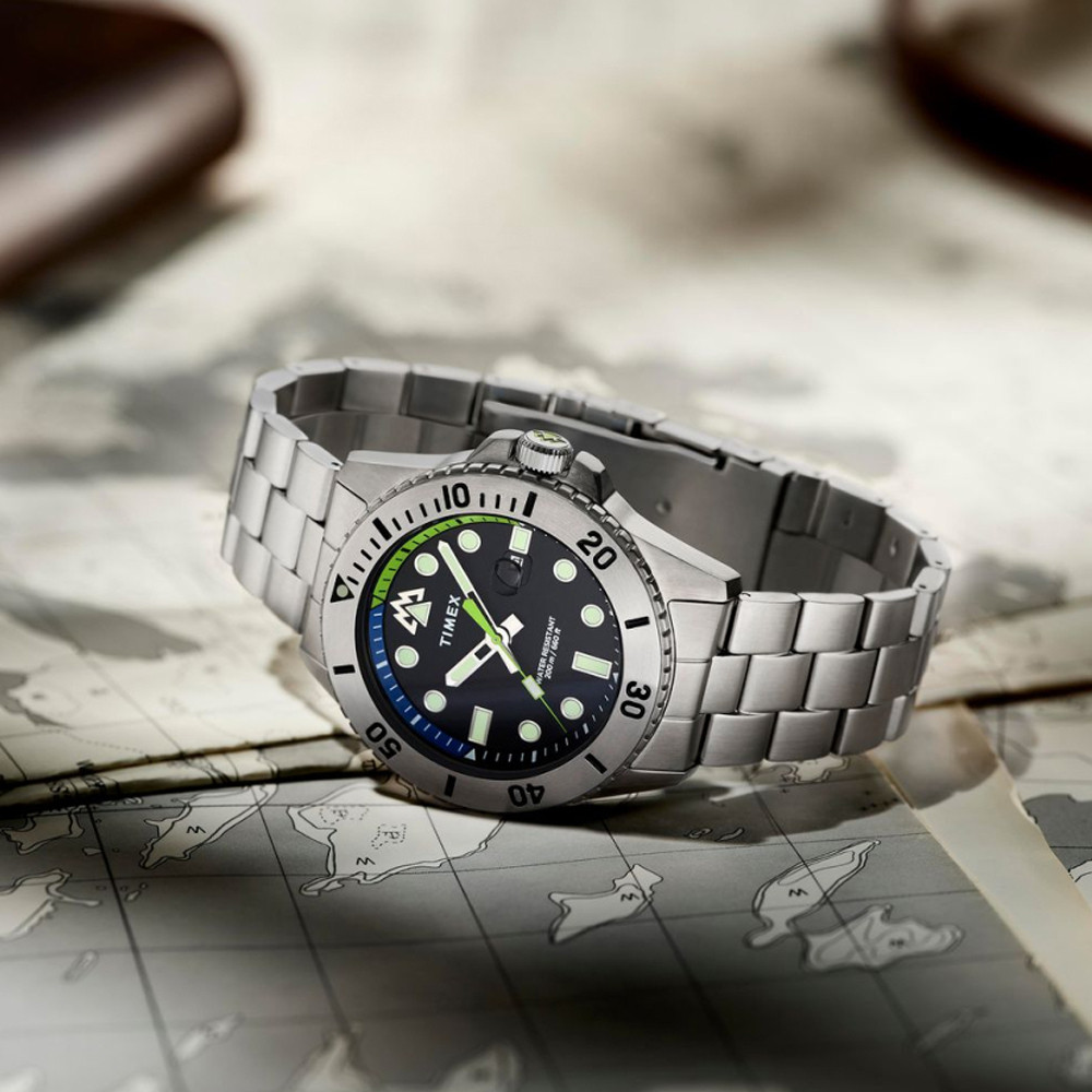 Чоловічий водонепроникний годинник Timex EXPEDITION North Anchorage 42 мм на сталевому браслеті. Лінійка Anchorage поповнила серію міцних годинників Expedition North® абсолютно новим корпусом з неіржавної сталі. Цей годинник має автентичний зовнішній вигляд справжніх дайверських годинників з енергійними деталями синього і салатового кольору на циферблаті, що легко зчитується. Великі люмінесцентні годинні мітки та стрілки; преміальне сапфірове скло з покриттям антиблік та збільшувачем дати для покращення огляду. Однонаправлено обертовий безель з храповим механізмом, який зручно використовувати в ролі аналогового таймера.