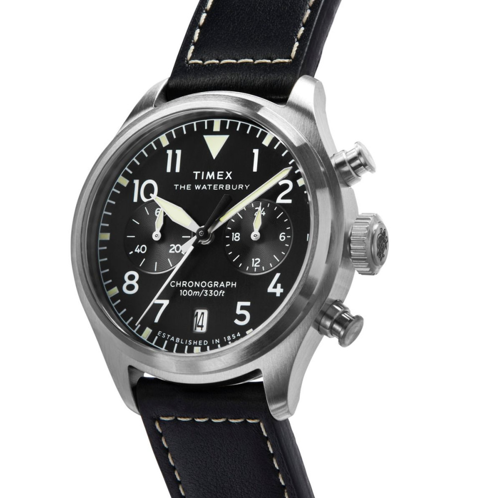 Timex WATERBURY Ace Chrono 41мм/чоловічий/кварцовий/чорний циберблат/чорний шкіряний ремінець /100м/Мінеральне скло/Сталевий корпус/Ремінець - 20мм /BoxVQ TW2Y19000 (США) Гарантія: 1 рік