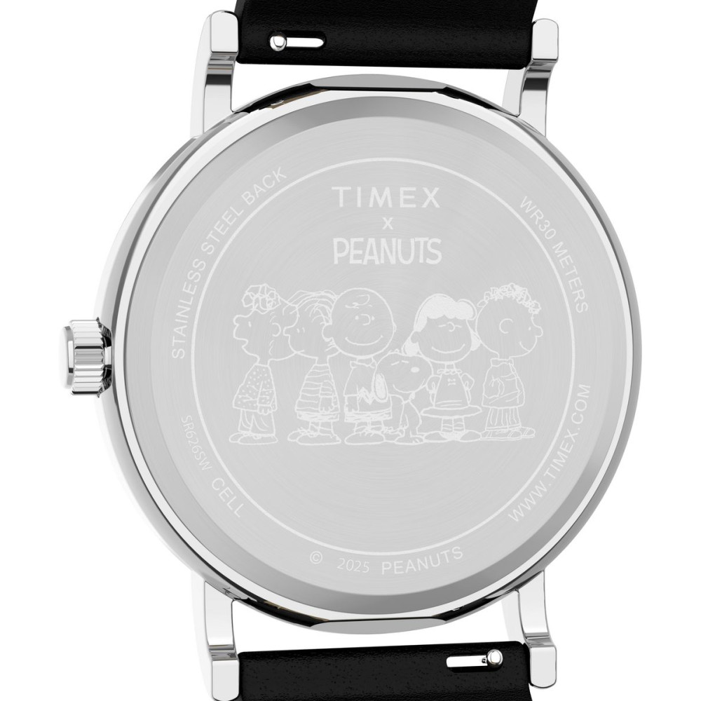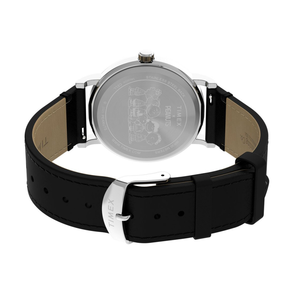 Кварцовий годинник Timex x Peanuts® Weekender Dancing 38 мм зі Снупі на циферблаті та чорним шкіряним ремінцем. Створений для шанувальників популярного американського коміксу Peanuts різного віку, цей грайливий годинник Timex Weekender передає веселощі і химерність Снупі та Вудстока на своєму чистому білому циферблаті. Timex доповнили його дизайн 38-міліметровим корпусом та гладким шкіряним ремінцем від S.B. Foot Tanning Co (компанія, яка з 1872 року займається виробництвом високоякісної шкіри для взуття та аксесуарів). Шкіряний ремінець із швидкознімним кріпленням. Для зняття пружинних штифтів, що кріплять ремінець до корпусу годинника, не потрібні жодні інструменти.