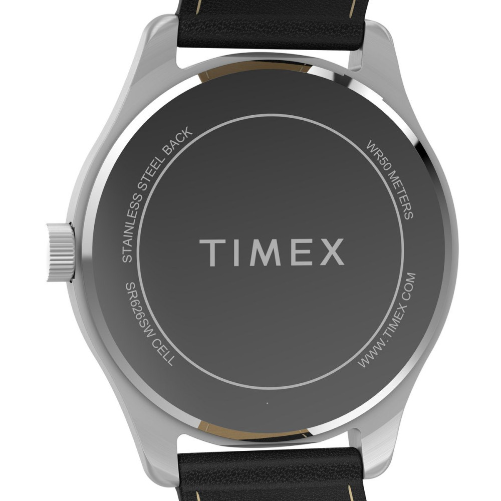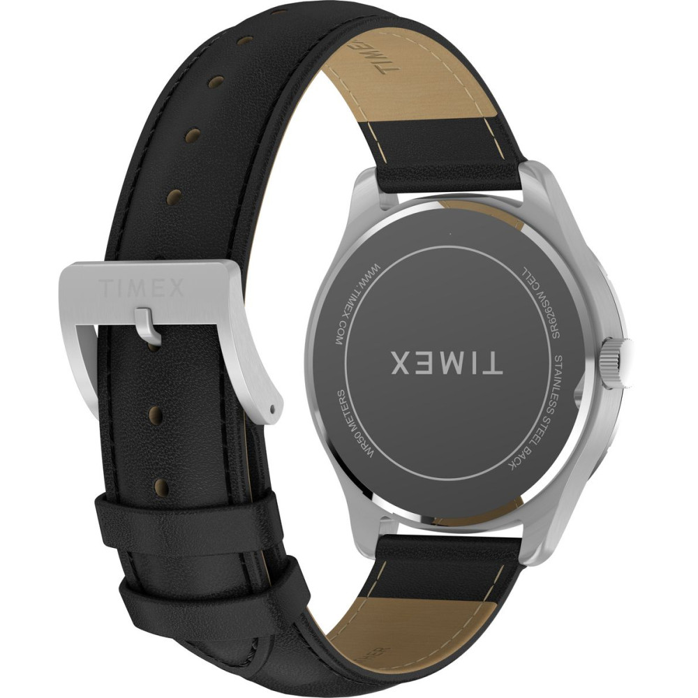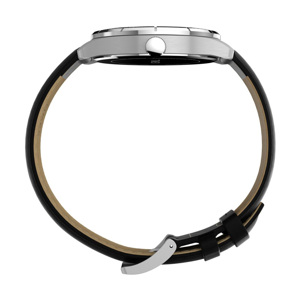 Чоловічий кварцовий годинник Timex MAIN STREET 42 мм з чорним циферблатом і чорним шкіряним ремінцем. Простий, але елегантний годинник на кожен день. Ця модель Main Street представлена з циферблатом з ефектом сонячних променів, висококонтрастними арабськими цифрами і стрілками, що світяться. Поліровані насічки вздовж фіксованого безеля надають корпусу з матовою поверхнею унікального декоративного елементу, а чорний ремінець з натуральної шкіри з гладкою текстурою завершує образ.