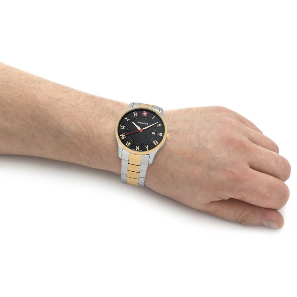 Швейцарський кварцовий годинник Wenger CITY CLASSIC з чорним циферблатом і двоколірним сталевим браслетом. Чоловіча класика з тонким, мінімалістичним силуетом, який ідеально підходить до ділового дрес-коду – легко ховається під манжетою сорочки, не задираючи її.