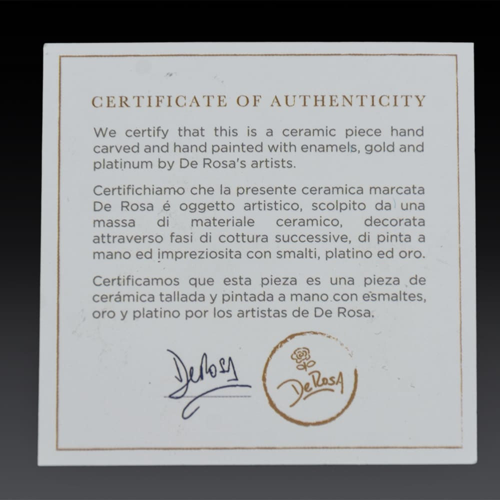 Чудово деталізовані статуетки De Rosa є втіленням виняткової майстерності: кожен виріб ретельно вирізаний та розписаний вручну в Уругваї. Майстерня De Rosa відома у всьому світі своїм художнім використанням платини, 18К золота та яскравої емалевої глазурі. Ця фігурка (як і всі фігурки з колекції De Rosa Rinconada) була вирізана та розписана вручну в Уругваї, потім двічі обпалена у печі. Оскільки всі вони розписані та вирізані вручну, немає двох абсолютно однакових. Це одна з чудових та унікальних особливостей De Rosa.