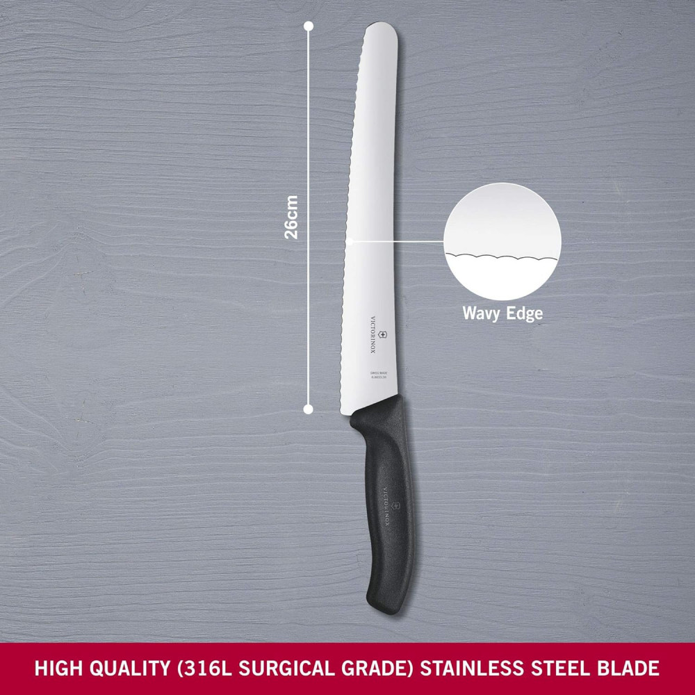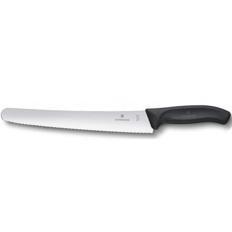 Короткий описVictorinox SWISS CLASSIC Ніж кондитерський Bread&Pastry з лезом 26 см / закруглений кінчик / серейторне / з чорною ручкою (у блістері) 333-26-W2 Швейцарія 6.8633.26B Гарантія: довічна