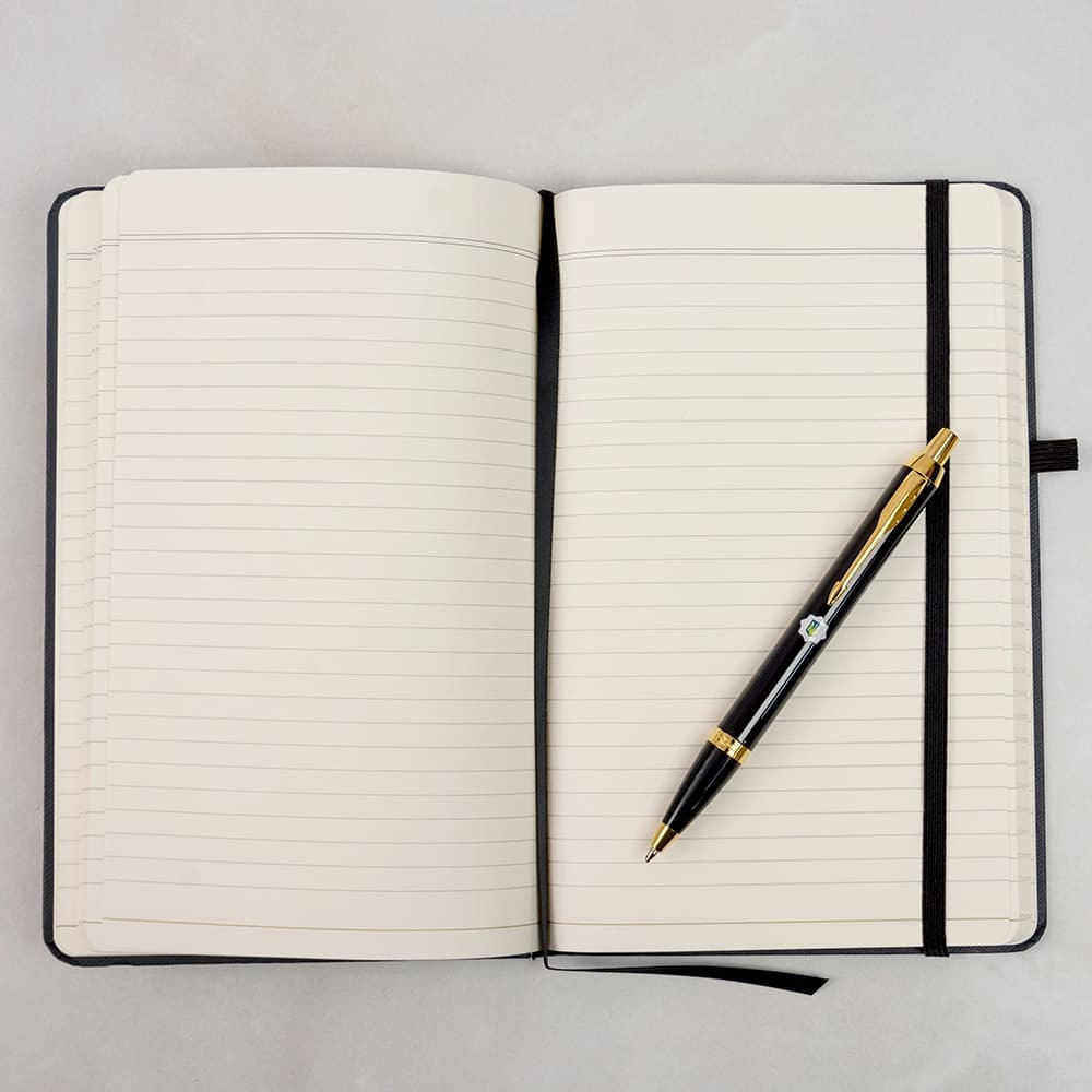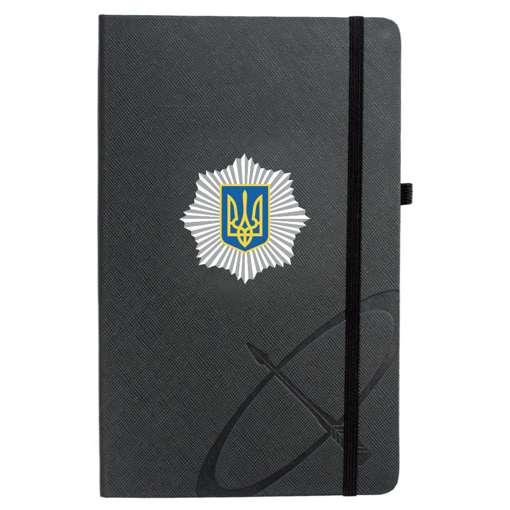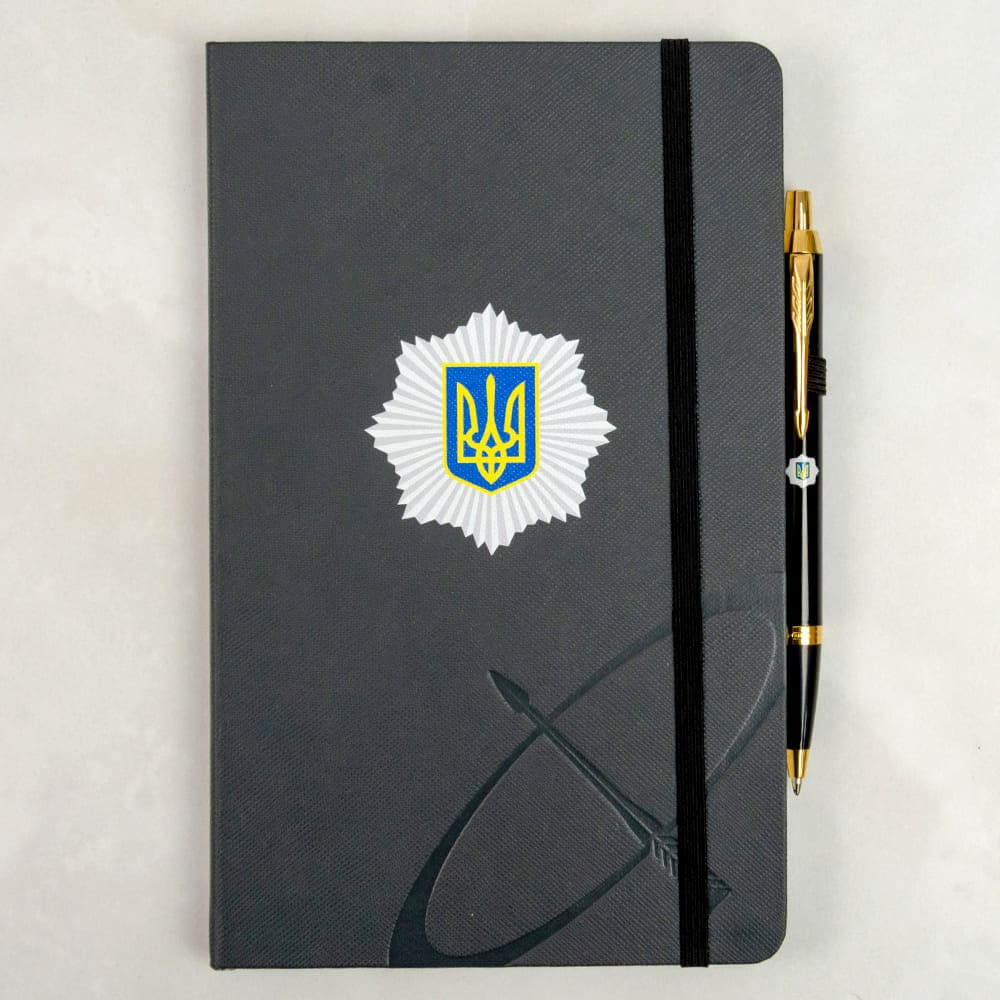 Сіра тверда палітурка з тисненим логотипом Parker та надрукованою Емблемою МВС України.