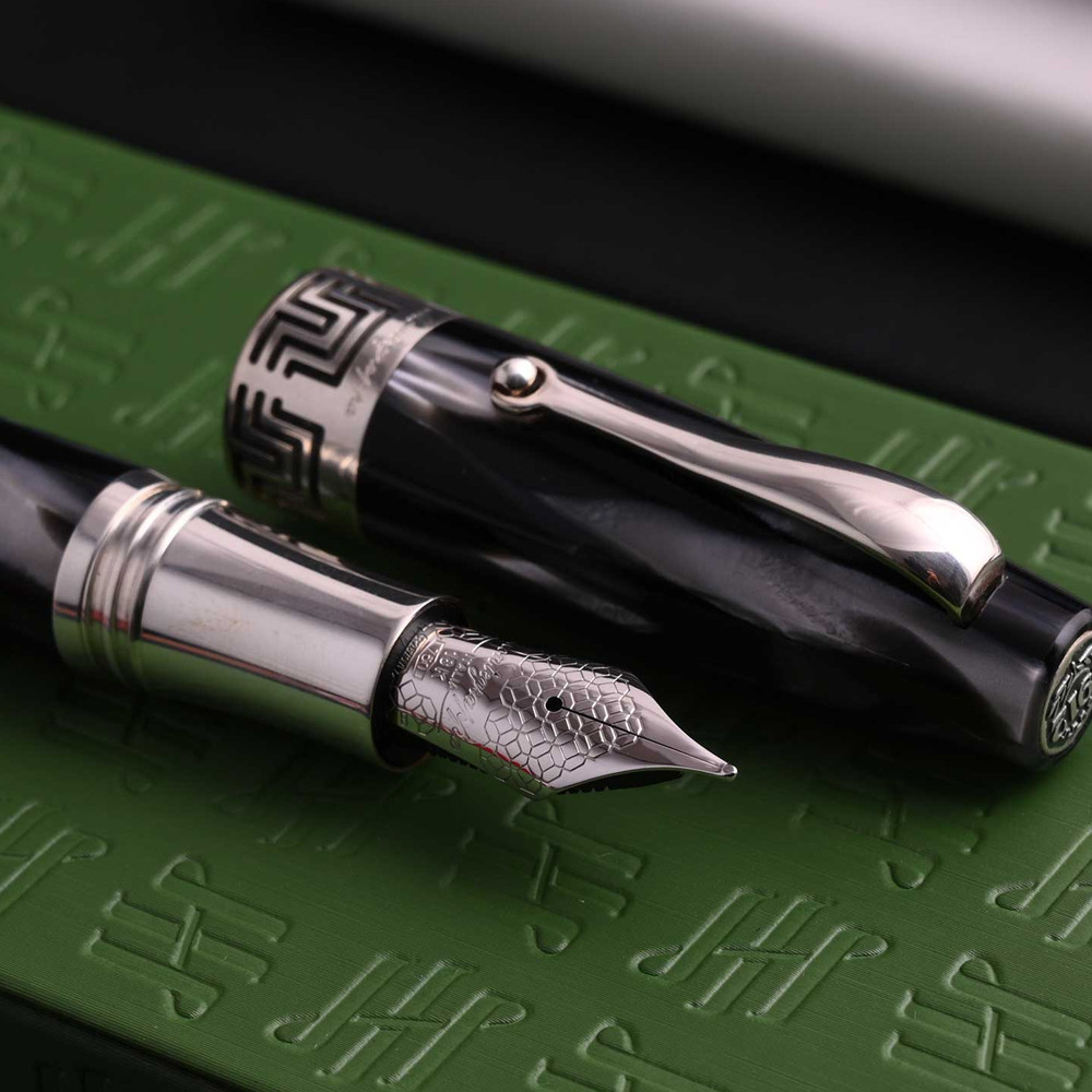 Декоративні елементи виготовлені зі срібла. Кільце ковпачка прикрашає грецький орнамент та гравіювання з логотипом бренду, а торець ковпачка – вигравіруваний рік заснування компанії Elmo & Montegrappa. Ковпачок оснащений практичним кліпом з кулькою, що обертається.