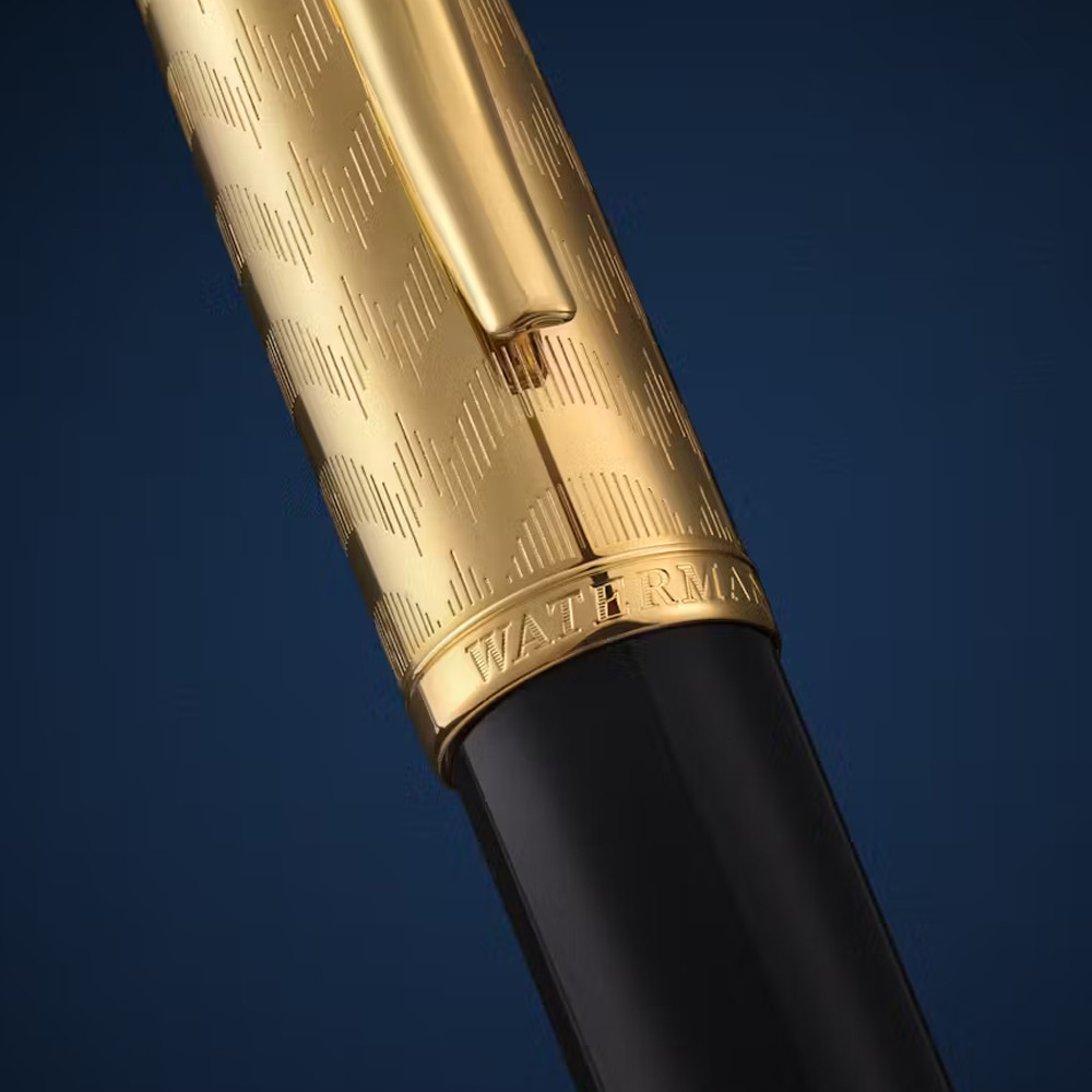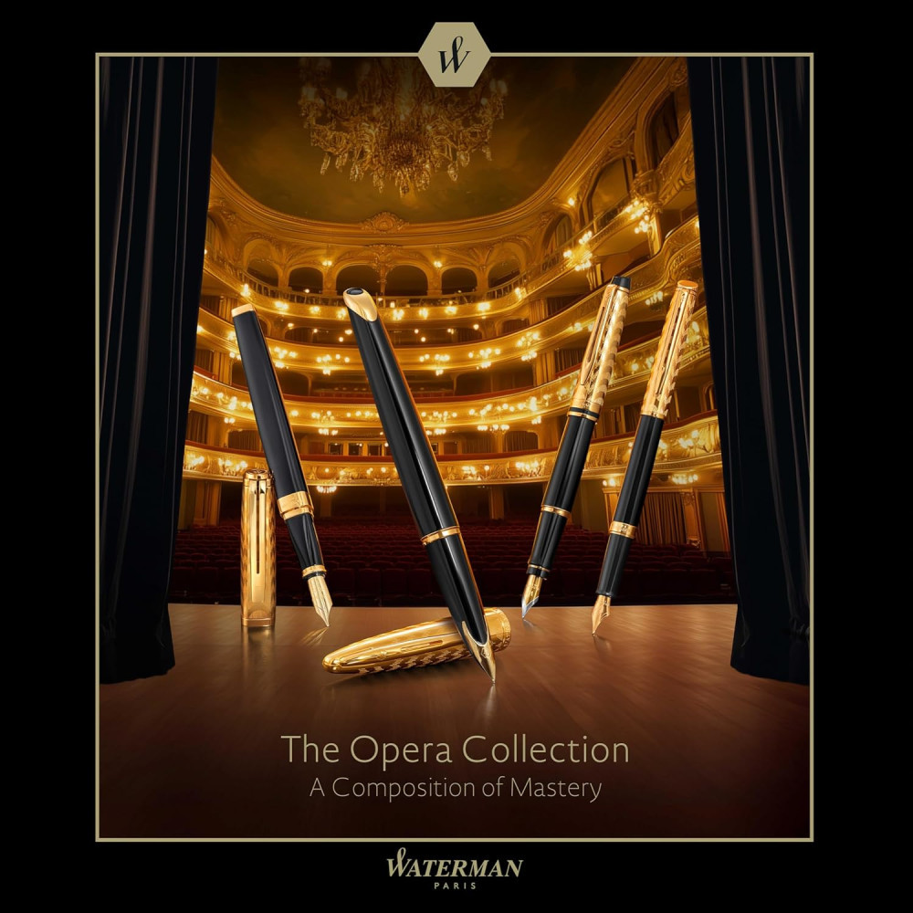 Вишукана кулькова ручка Waterman CARENE Opera GT з чорним лаком і позолоченим гравірованим ковпачком поворотного типу. Велич Паризької опери (Гранд-опера) століттями надихала публіку; тепер настала черга колекції Waterman Opera. Чорний лак та золото доповнюють вишукано вигравіруваний візерунок на ковпачку, відтворюючи позачасову елегантність та багату деталізацію французьких оперних театрів. Округлі, витончені вигини колекції CARENE, натхненні силуетом розкішних човнів, оздоблення дорогоцінними металами та ексклюзивний дизайн - ця ручка випромінює розкіш.