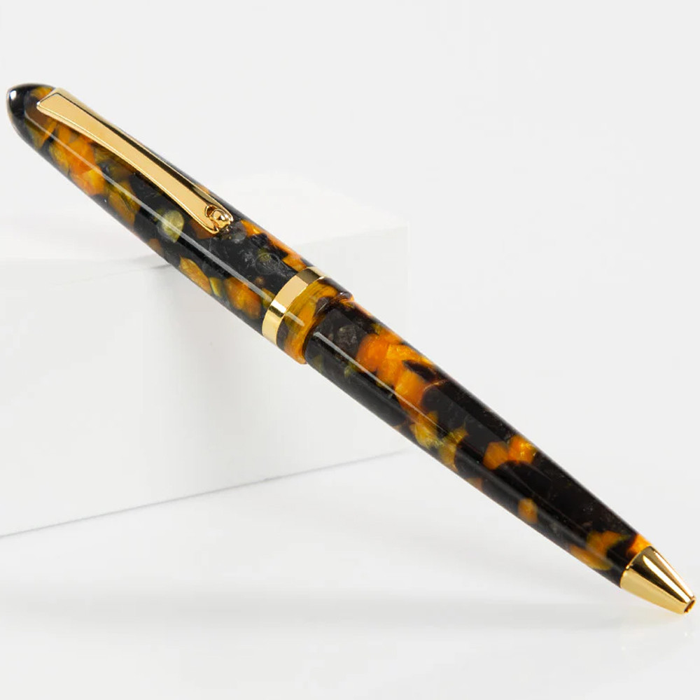 Montegrappa VENETIA Havana Amber (модель ISVENBAO) - вінтажна кулькова ручка у бурштиновому дизайні з позолотою та поворотним механізмом ковпачка. Venetia – регулярна колекція Montegrappa, яка отримала свою назву на честь величної Венеції і стала продовженням нового класу ручок у стилі Vintage. Її образи, кольори та форми відроджені з багатого архіву Montegrappa початку ХХ століття, де зберігається спадщина бренду. Ця архівна репродукція Venetia відрізняється насиченим корпусом, демонструючи майстерність токарної обробки ранніх моделей Montegrappa, із загостреними кінцями та позолоченим оздобленням на латуні. На ковпачку зображена амбіграма з логотипом бренду, розміщена в ромбі - це історичне написання нагадує про перші зареєстровані зразки Montegrappa, коли ім'я компанії вперше з'явилося на письмовому інструменті.