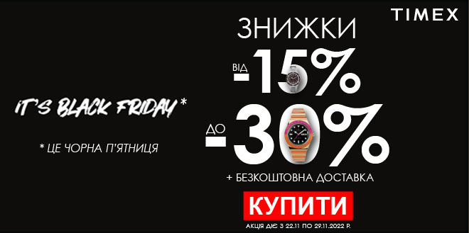 Чорна п'ятниця 2022 Знижки до -30% на годинники Timex!