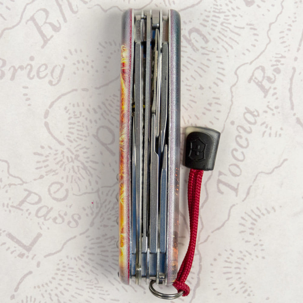 | Функції | Кільце для ключів, Пінцет, Зубочистка, Ножиці, Мале лезо, Штопор, Шпилька, Пилка по дереву, Гачок багатоцільовий, Шило - кернер, Велике лезо, Відкривачка для пляшок, Консервний ніж, Мала плоска викрутка, Велика плоска викрутка, Паз для зняття ізоляції |