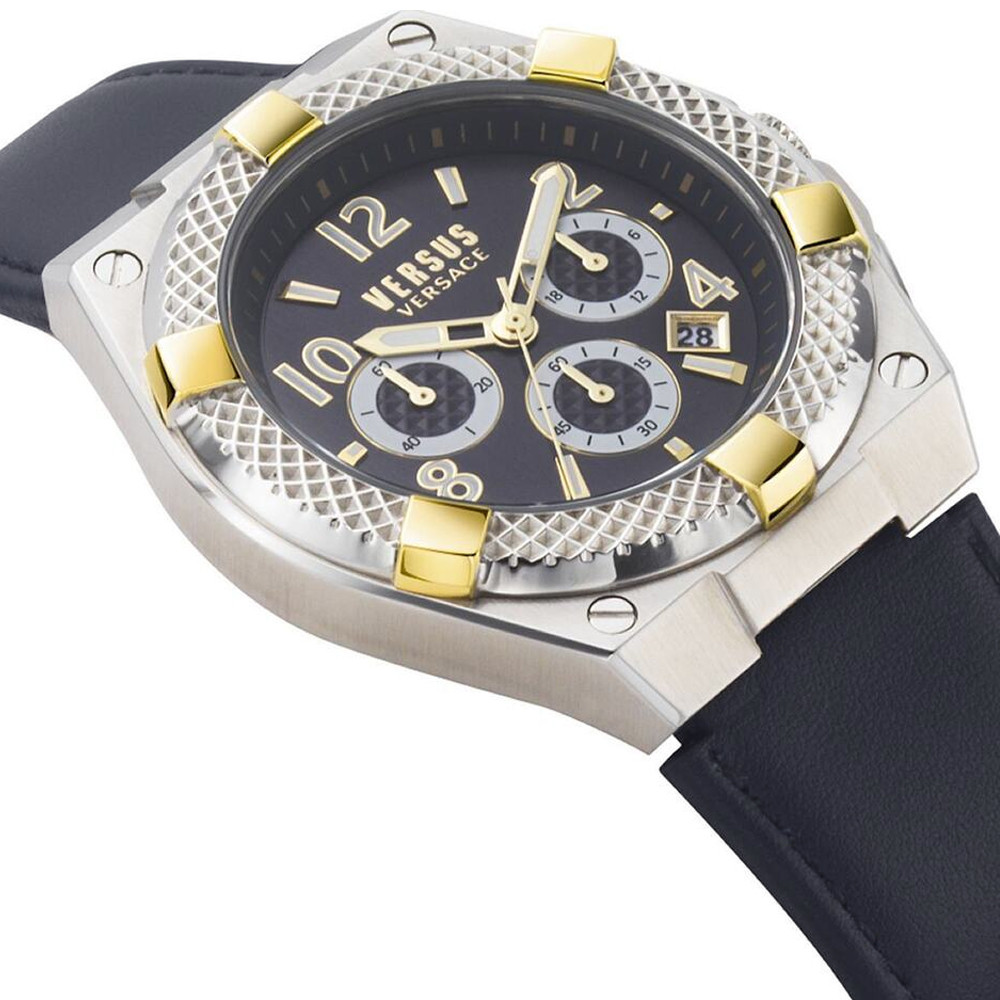 Чоловічий годинник-хронограф VERSUS by VERSACE з колекції ESTEVE на темно-синьому шкіряному ремінці. Великий сталевий корпус (ширина 46 мм та товщина 12 мм) з частковою PVD позолотою елементів та різьбленим візерунком на безелі та заводній головці. Стилю додають також декоративні гвинти на корпусі, що чудово поєднуються з дизайном бічних кнопок. Мінеральне скло та циферблат хронографа з датою. Працює від кварцового механізму, для якого характерна точність ходу та максимальна простота обслуговування.