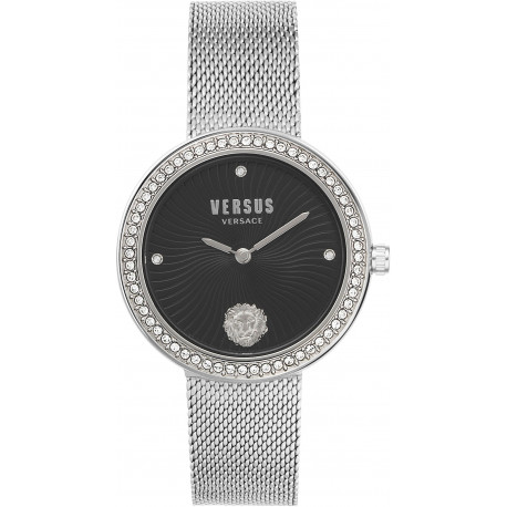 Сріблястий жіночий годинник Versus Versace Lea VSPEN0719 з кристалами Swarovski на обідку корпусу та індексами, інкрустованим тими ж блискучими камінцями. Вишуканий чорний циферблат прикрашений хвилеподібним малюнком і фірмовим логотипом модного бренда - головою лева.