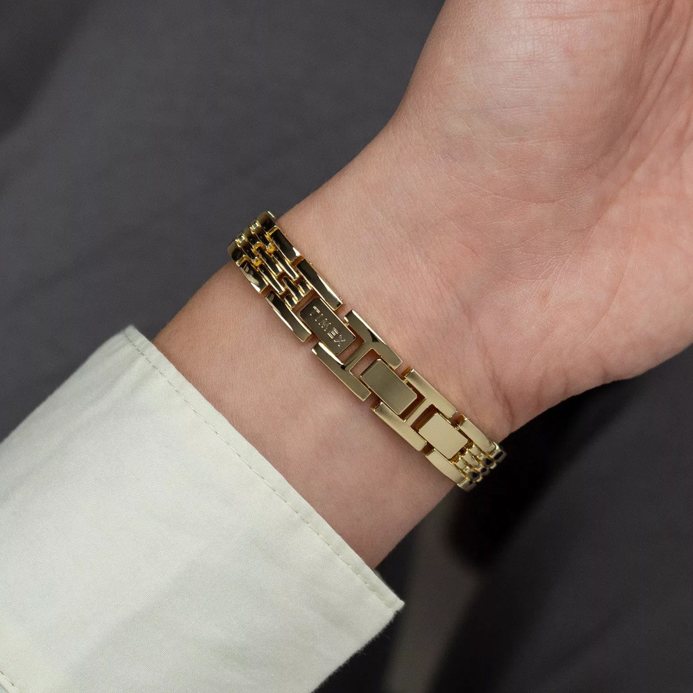 ✔ Золотистий браслет із металевого сплаву з полірованою обробкою.