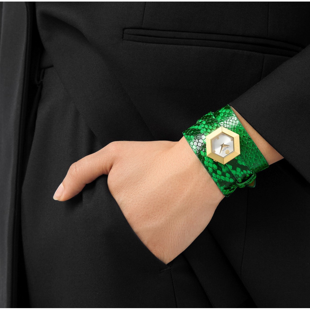 Жіночий брендовий годинник Philipp Plein PW6FA0225 LA JUNGLE DE PLEIN 28 мм з двома змінними ремінцями чорного та зеленого кольору. Дикі серцем Philipp Plein представляють сміливе поєднання розкоші та усвідомлених інновацій у колекції La Jungle de Plein - екологічний годинник з анімалістичним принтом, створений для веганів. Поєднуючи екзотичний стиль із безстрашним духом, колекція втілює в собі неприборкану елегантність тваринного світу, переосмислену в екологічній формі. Кожен годинник має шестикутний корпус діаметром 28 мм, виготовлений із 100% переробленої неіржавної сталі, та подвійний ремінець із ефектної шкіряної альтернативи з яскравими анімалістичними принтами.