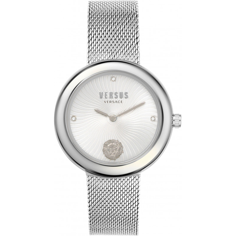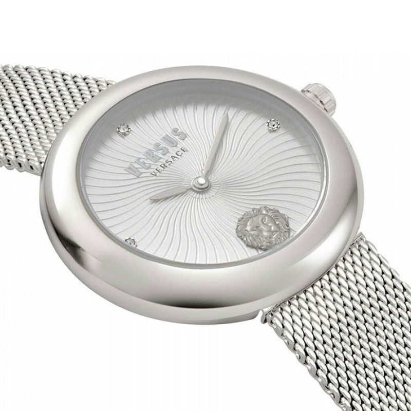 Серебристые стальные часы для женщин Versus Versace VSPEN0419 из коллекции Lea. Циферблат украшен волнообразным рисунком, кристаллами Swarovski и фирменным логотипом модного бренда Versus – головой льва.