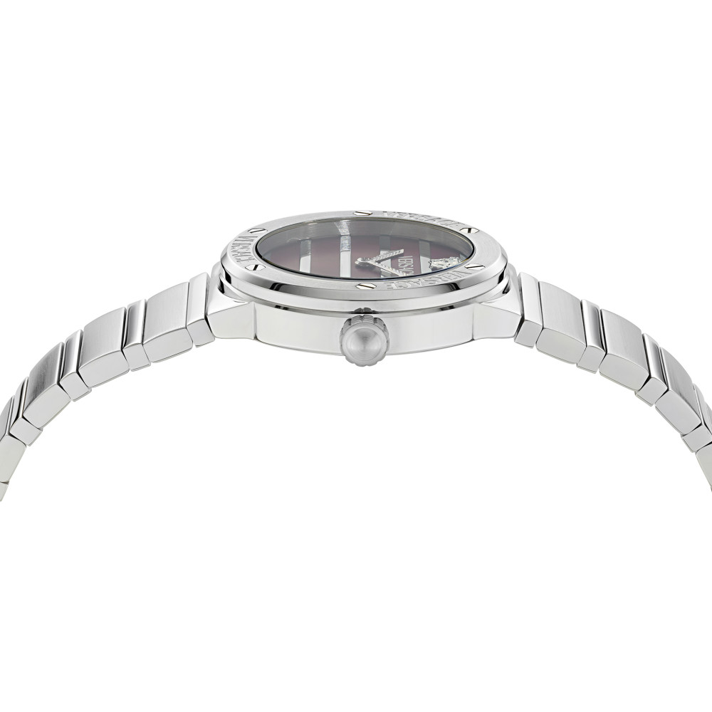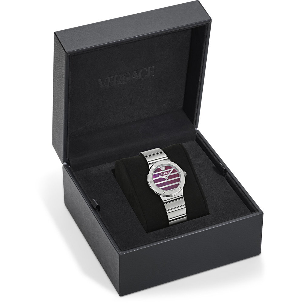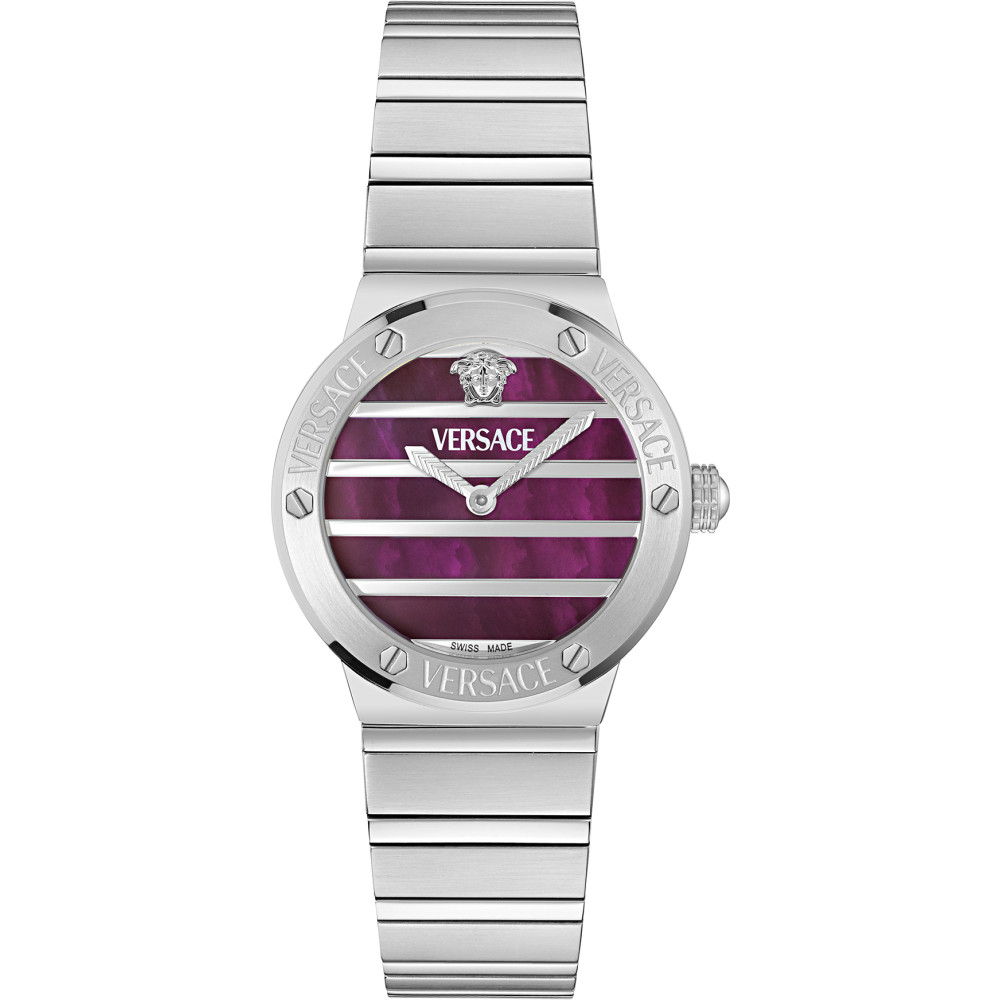 Versace GRECA LOGO PEARL 33мм/женские часы/кварцевые/перламутрово-бордовый циферблат/стальной браслет /30м/Сапфировое антибликовое стекло/Стальной корпус Швейцария VE0S00125 Гарантия: 2 года