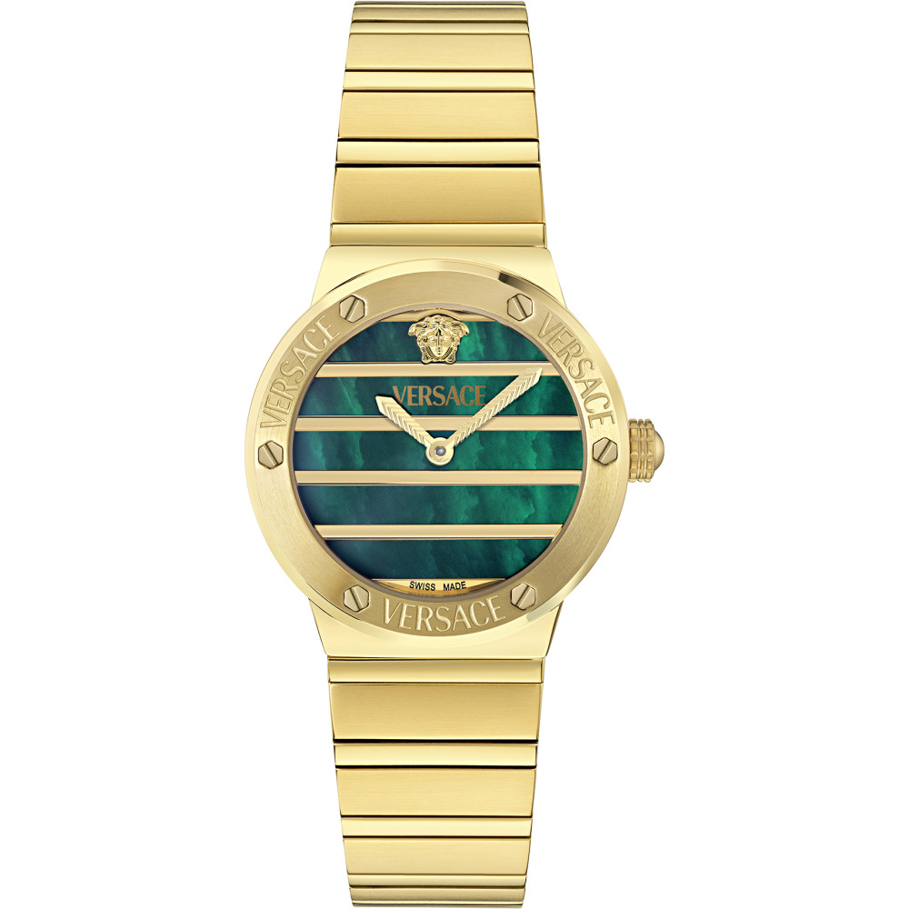 Versace GRECA LOGO PEARL 33мм/женские часы/кварцевые/перламутрово-зеленый циферблат/стальной браслет /30м/Сапфировое антибликовое стекло/Золотистый стальной корпус Швейцария VE0S00425 Гарантия: 2 года