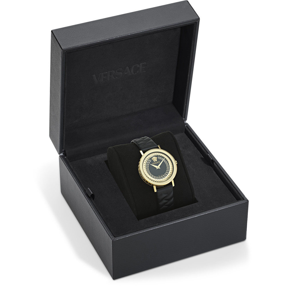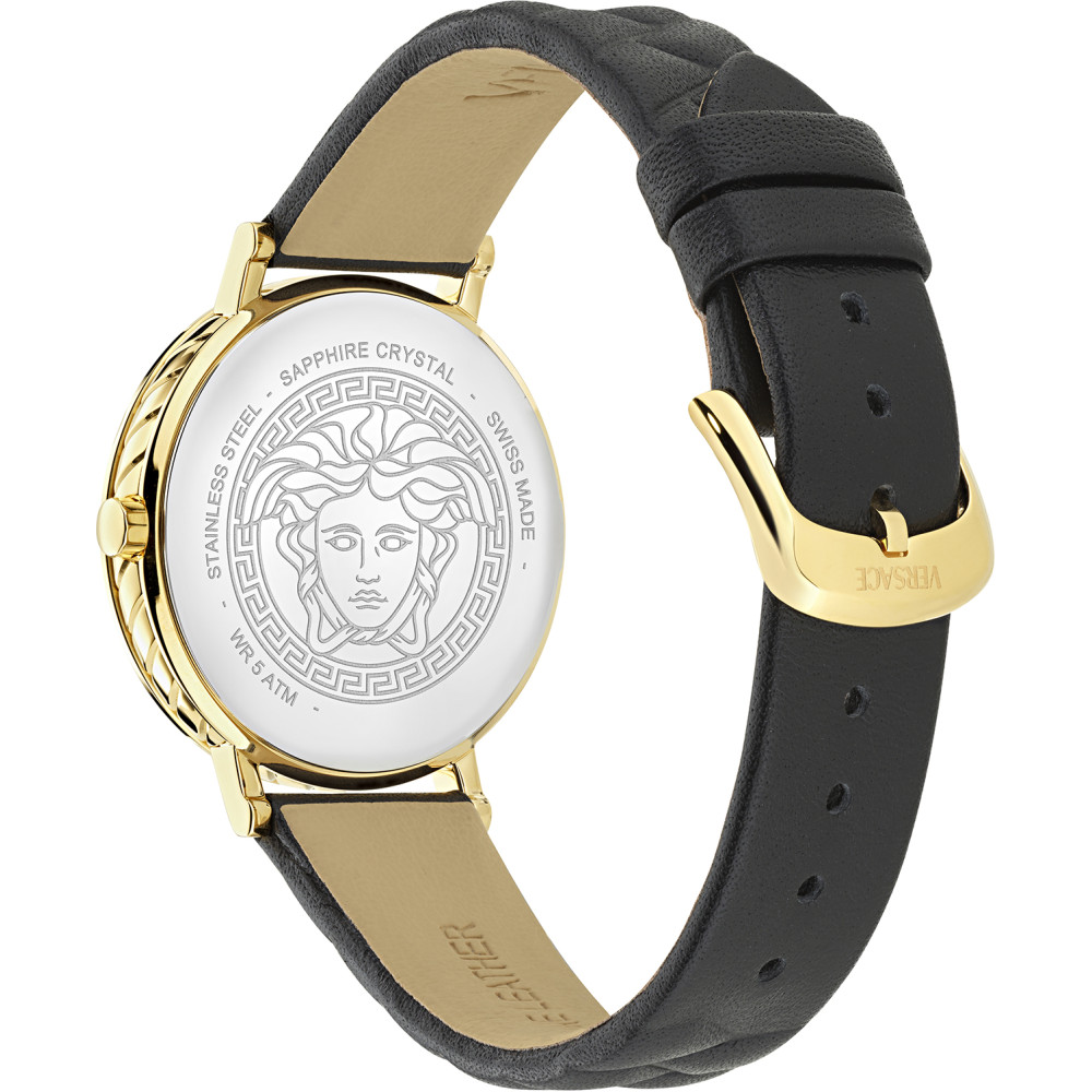 Versace DELPHINUS 35мм/женские часы/кварцевые/черный циферблат/черный кожаный ремешок /50м/Сапфировое антибликовое стекло/Золотистый стальной корпус Швейцария VE0O00125 Гарантия: 2 года