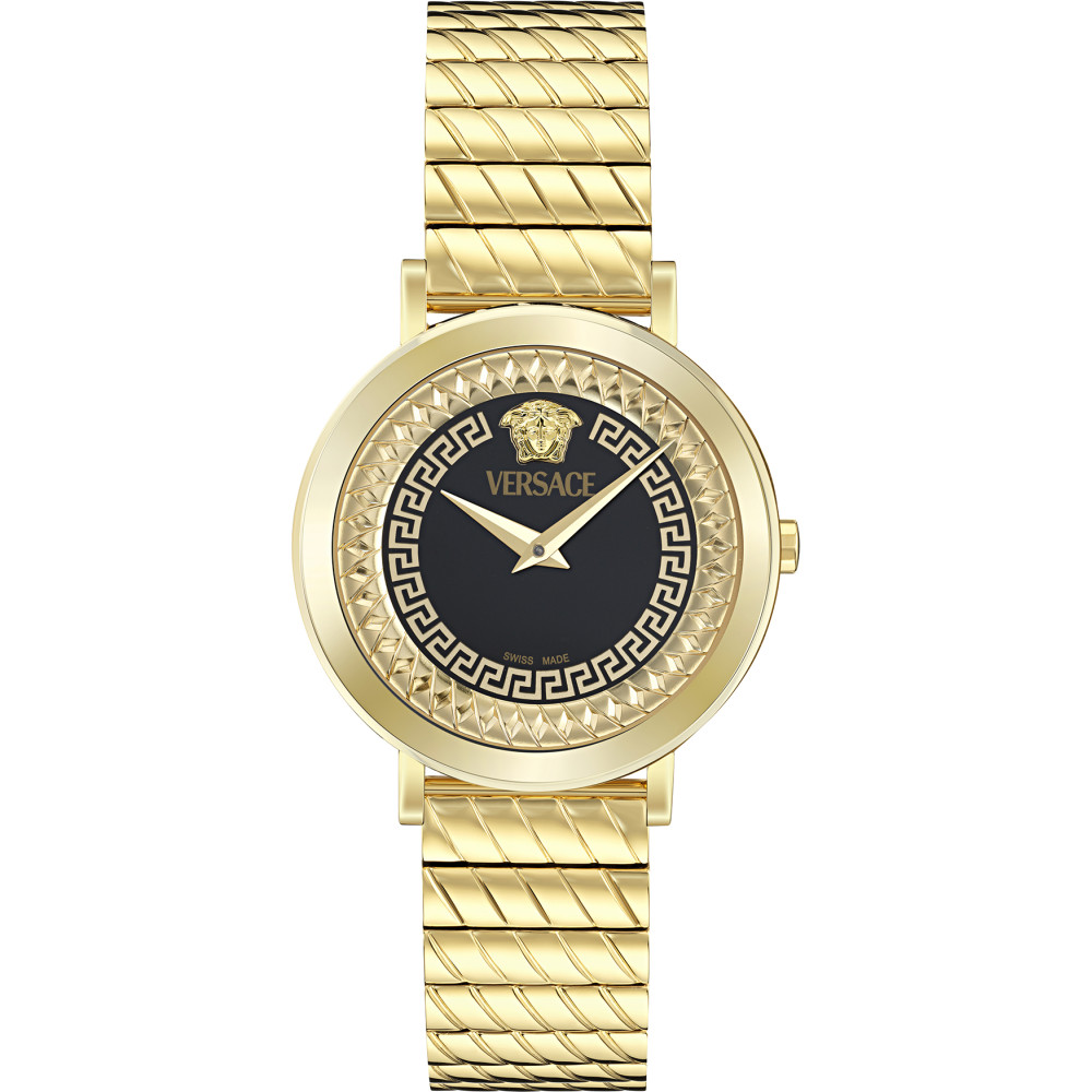 Versace DELPHINUS 35мм/женские часы/кварцевые/черный циферблат/стальной браслет /50м/Сапфировое антибликовое стекло/Золотистый стальной корпус Швейцария VE0O00425 Гарантия: 2 года