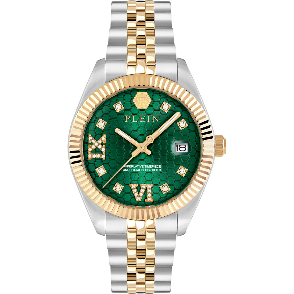 Philipp Plein DATE SUPERLATIVE 34мм/женские часы/кварцевые/зеленый циферблат с кристаллами/стальной браслет /50м/Стальной корпус с GP Италия PWYFA0225 Гарантия: 2 года